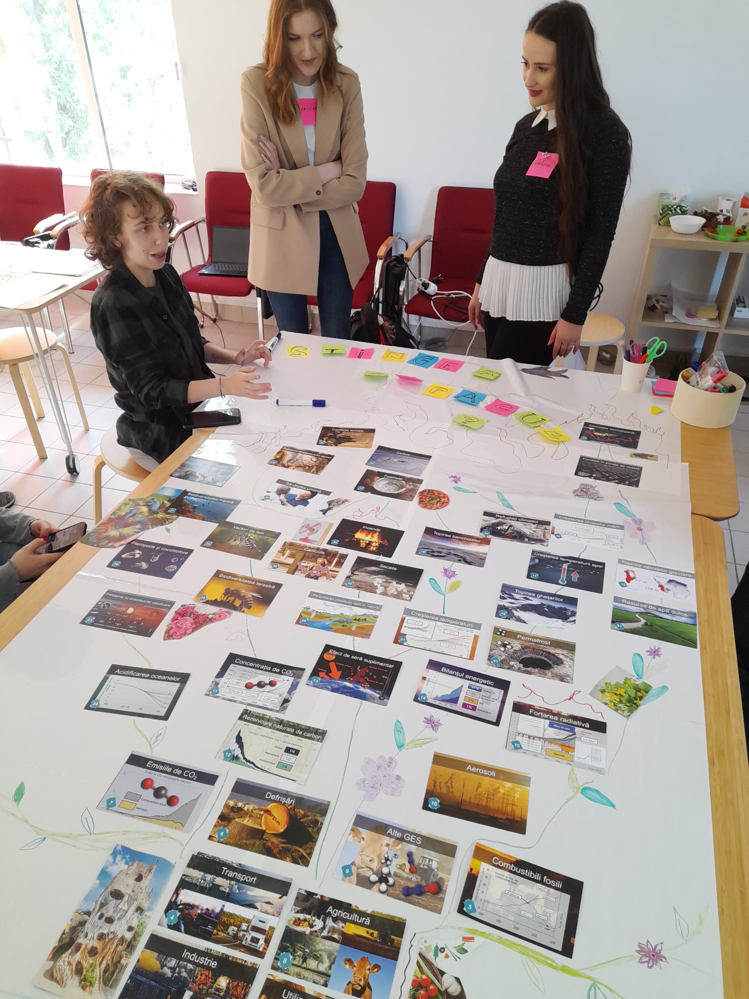 Centrul de Învățare a găzduit pe 22 și 23 mai 2024 două ateliere de Colaj Climatic, facilitate de dr. Elena Ungureanu. Aceasta este o activitate destinată să ofere studenților cunoștințe esențiale despre schimbările climatice într-un mod unic și colaborativ. În cadrul sesiunii studenții au lucrat în grup pentru a crea o frescă ce ilustrează legăturile complexe între diferitele cauze ale schimbărilor climatice și efectele lor asupra planetei noastre.