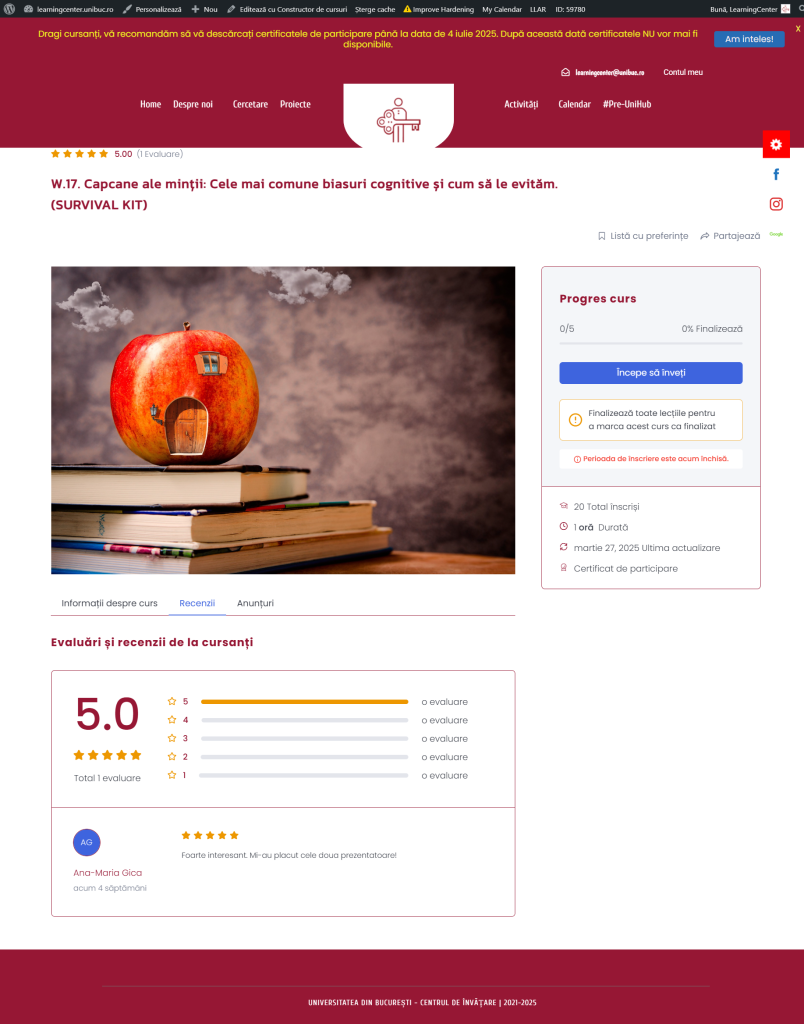 Descoperă cele mai frecvente capcane ale gândirii și învață cum să le eviți pentru a lua decizii mai clare și mai obiective. În acest workshop interactiv, vei explora biasurile cognitive și vei afla strategii practice pentru a-ți îmbunătăți raționamentul și analiza critică