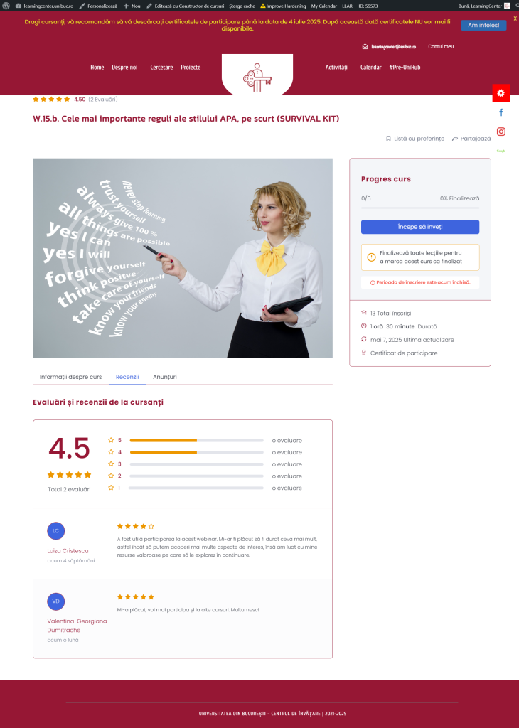 stil academic, metode de citare – utile pentru studenții și studentele de la ciclul licență, din domeniul științelor sociale. Activitățile organizate vor oferi acestora tehnicile și cunoștințele de bază necesare pentru dezvoltarea sau îmbunătățirea abilităților de comunicare academică scrisă. Studenții vor analiza și elabora texte academice pentru a se familiariza sau pentru a consolida bunele practici în domeniu.
