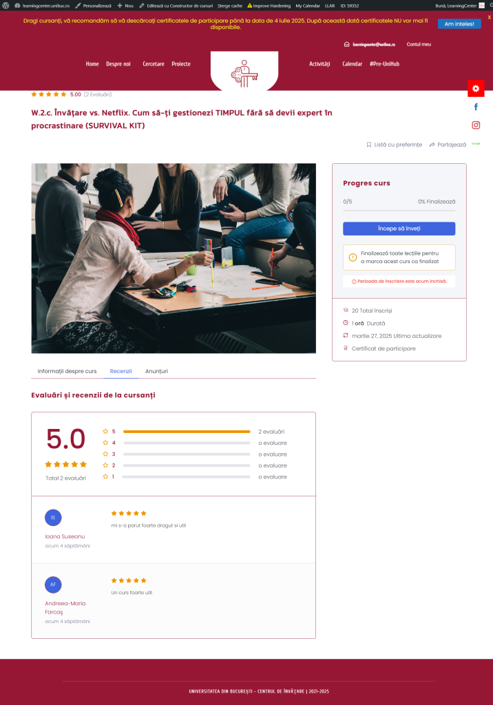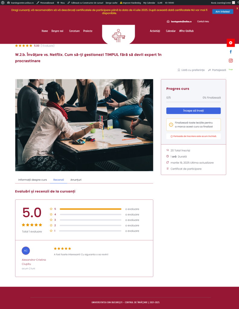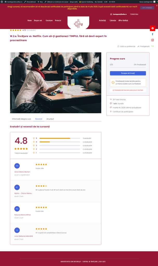 Te-ai trezit vreodată studiind toată noaptea înainte de examen și promițându-ți că „data viitoare” te organizezi mai bine? Acest workshop vă oferă tehnici practice pentru a-ți gestiona timpul eficient, astfel încât să înveți mai inteligent, nu mai mult. Vom explora metode de prioritizare, planificare și combatere a procrastinării, astfel încât să ai timp și pentru studiu, și pentru viața personală. Prin exerciții interactive și exemple reale, vei descoperi cum să transformi timpul dintr-un dușman într-un aliat al succesului tău academic!