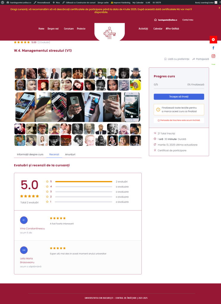 După crearea contului platforma Centrului de Învățare UB, veți recepționa un email pentru validarea adresei de e-mail. Nevalidarea adresei duce la ștergerea contului în 24 h de la crearea contului.