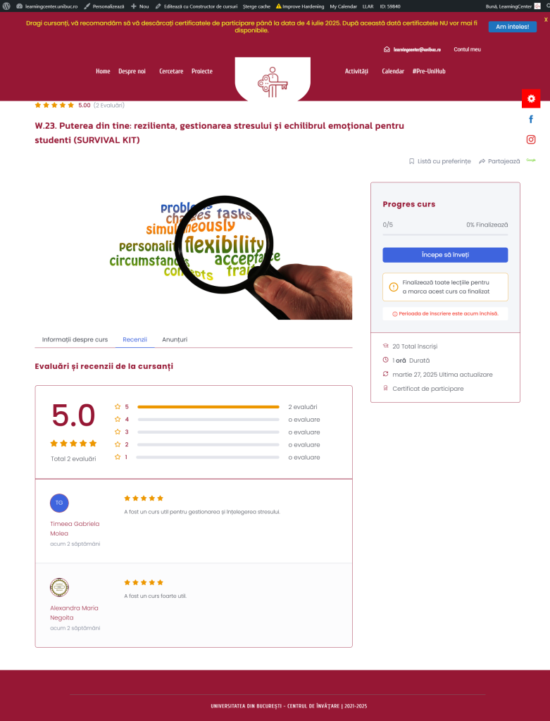Acest atelier este conceput special pentru studenți și își propune sa ofere instrumente practice pentru dezvoltarea rezilientei, gestionarea stresului și menținerea echilibrului emotional în fata problemelor academice și personale.